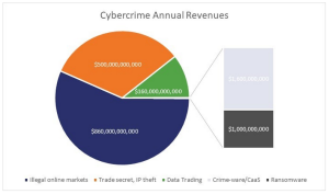 Al di là dei meri numeri (le stime 2017 parlano di 1.500 miliardi di USD, poco meno del PIL dell’Italia) è interessante osservare come sono divile le “aree di business” di riferimento per il cyber crime. Più del 50% delle revenue viene da “illegal online markets”, mercato fortemente legato al tema Dark Web… ma ne parliamo in un altro post. Il resto del “mercato” si muove attorno al commercio di informazioni.
