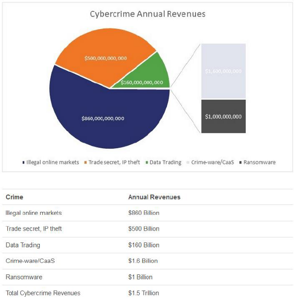 E’ inoltre interessante analizzare le revenues di questo modello di business per comprendere su quali fronti il crimine informatico è più attivo. Una stima proposta tra il 2019 ed il 2020 da più studi tra cui Atlas parlava di un 1.500 miliardi di USD l’anno… quasi il PIL di un paese industrializzato.