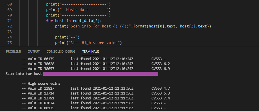 Nella p-o-c ho riportato qualche esempio di accesso alle API di Qualys e Nessus relative ai dati dei report: https://github.com/roccosicilia/sToolz/tree/master/GetVulnReport