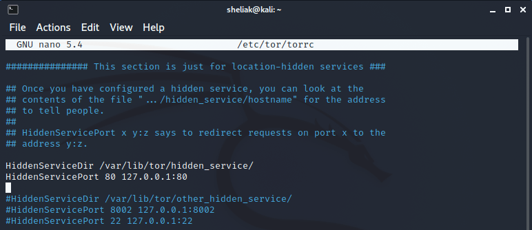 Per configurare un “sito cipolla” è sufficiente accedere al file di configurazione di Tor in /etc/tor/torrc e definire la configurazione del servizio dichiarando il path per i file di configurazione. Viene inoltre dichiarata la porta del servizio da non interpretare come un sistema di pubblicazione: il servizio Tor si limiterà ad eseguire l’inoltro dei pacchetto in ingresso sulla porta 80 (visto che voglio intercettare il traffico http) vero il web server attivo sul sistema (apache2) precedentemente installato durante il setup del laboratorio.