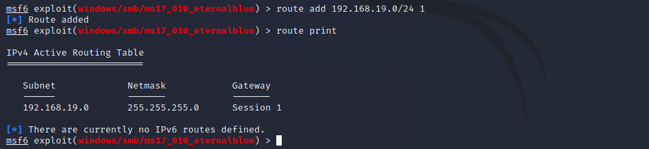 Dalle informazioni in nostro possesso possiamo ipotizzare che vi siano effettivamente altri sistemi sulla rete “interna” ed è quindi utile indagare ulteriormente attraverso una scansione di rete. Per eseguire questa operazione dovremmo poter lanciare la scan dalla macchina compromessa in quando ha diretta visibilità della rete. Questa operazione, per quanto fattibile, non è particolarmente comoda. Il pivoting ci consente di utilizzare la macchina “esterna” come ponte per la rete interna esattamente come farebbe un router. Con il comando “background” possiamo uscire dalla sessione di meterpreter senza chiuderla ed aggiungere una nuova rotta al solo sistema affinché la rete 192.168.19.0/24 sia raggiungile a Level 3.