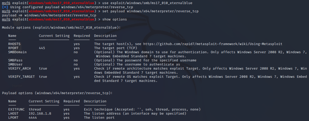 Senza dilungarci troppo sull’utilizzo di metasploit (mi avete già in molti chiesto una sessione su questo strumento, la preparerò), utilizzeremo la vulnerabilità CVE-2017-0144, che consente una Remote Code Execution (RCE) sul sistema target al quale faremo eseguire uno specifico payload: una reverse shell di meterpreter.