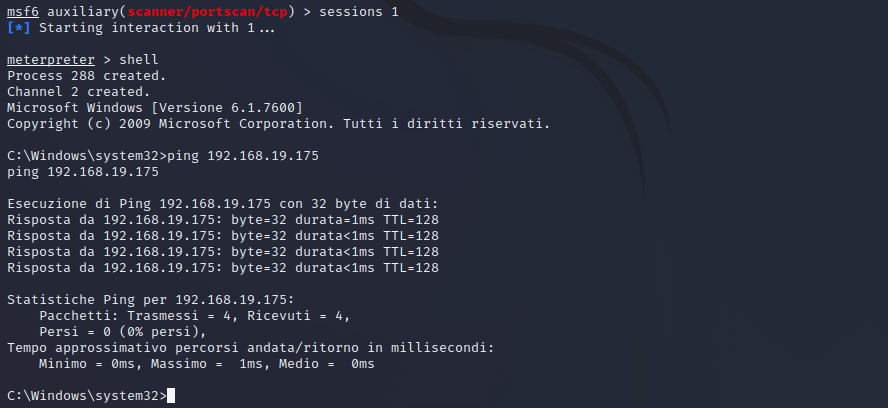Nel caso specifico la scansione ha individuato un sistema raggiungibile dalla macchina compromessa con il 192.168.19.175 con la porta 445 in ascolto. Una prova per verificare questo risultato potrebbe essere un tentativo di comunicazione dalla macchina target, sarà sufficiente tornare nella sessione meterpreter relativa: