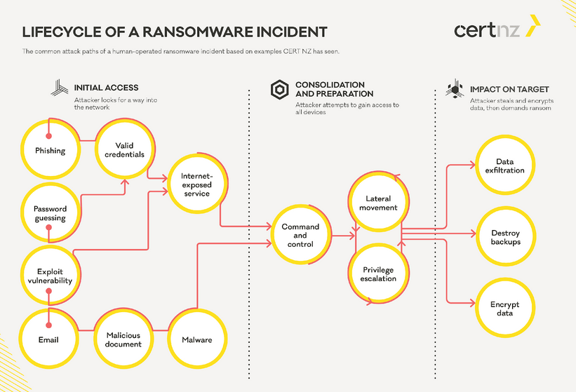 Spesso si ha l’idea che un attacco sia una singola e deflagrante azione, un singolo colpo. Ciò che avviene è in realtà molto diverso sia per la quantità di attività che precedono l’azione di attacco vero e proprio che per i tempi che queste attività richiedono. Gli addetti ai lavori parlano infatti di “fasi” di un attacco informatico. Esistono diversi modelli che sintetizzano le fasi di un attacco di cui nell’immagine che segue ne riporto uno relativamente recente in riferimento ad una specifica tipologia di attacco: i ransomware.