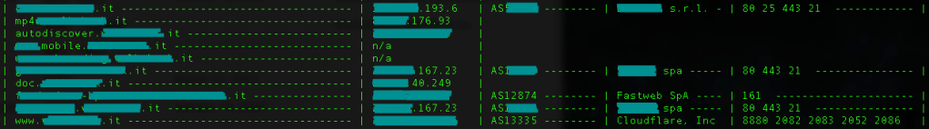 Non è raro trovare subdomain che si riferiscono a sistemi di test – spesso dimenticati – o a sistemi in una fase di staging che espongono elementi di debugging dell’applicazione (trovati tantissimi in queste condizioni). Arricchendo un po’ il risultato si possono ottenere informazioni aggiuntive sui provider in uso per i vari domini così da mappare qualche fornitore o collaboratore. Aggregando un po’ di dati pubblici il risultato diventa parecchio interessante.