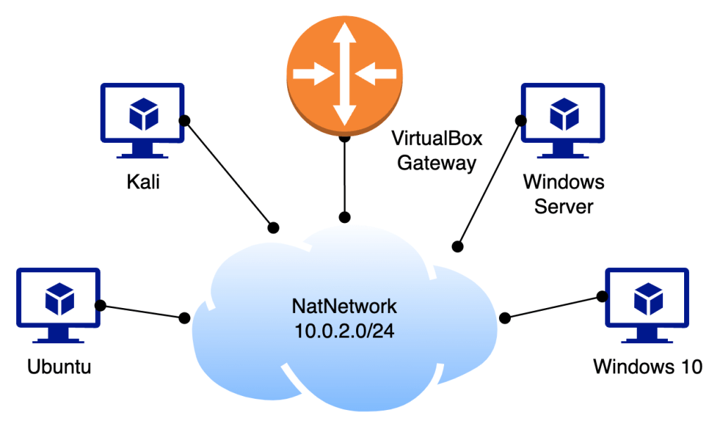 Per una questione di mio personale ordine mentale preferisco configurare una rete separata per le macchine di laboratorio dietro NAT. Su VirtualBox si può ottenere facilmente creando una nuova NatNetwork: nel mio caso la rete selezionata è la 10.0.2.0/24 con DHCP rilasciato direttamente dal software di virtualizzazione. Per raggiungere gli ambienti dalla mia Workstation (un MacBook) configurerò dei NAT specifici, per iniziare sono sufficienti i NAT per SSH delle due macchina linux e RDP per le due macchina Windows.