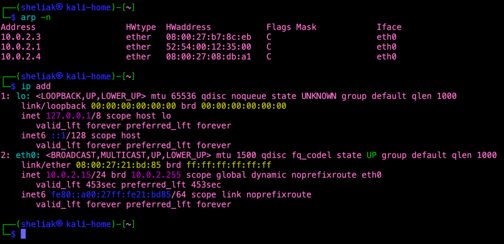 E’ ovviamente necessario assicurarsi che la macchina sia in grado di dialogare con il sistema target attraverso la rete virtuale appositamente creata. Essendo tutti i sistemi nello stesso dominio di broadcast potremo fare una verifica eseguendo un ping verso gli altri sistemi e utilizzando il comando arp -n per ottenere l’arp table della macchina e gli host noti a livello 2:
