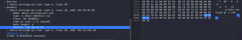 E’ ben visibile l’IP del server di riferimento associato al mio domain name: 192.30.45.30. Sulla destra il contenuto raw del pacchetto dove vediamo il relativo esadecimale dell’IP che abbiamo avuto in risposta (in forma decimale): c0 1e 2d 1e. La query whois viene quindi eseguita verso il server indicato nella risposta del DNS e sarà quindi questo server ad inviarci il testo in risposta.