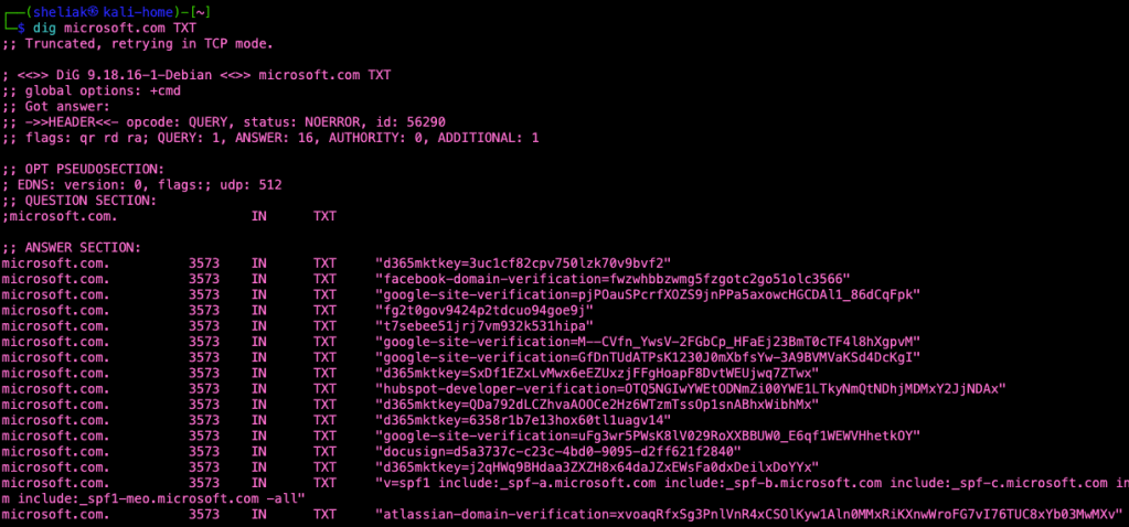 Vorrei dare solo qualche spunto su argomenti che ho ampiamente trattato in vari articolo, live, workshop, ecc. La zona DNS mette a disposizione una montagna di informazioni sul perimetro del target. Con una semplicissima utility come dig o nslookup possiamo chiedere informazioni specifiche ai Name Server sul domonio che stiamo analizzando. Facciamo una prova con un dominio chiedendo i record di tipo TXT: