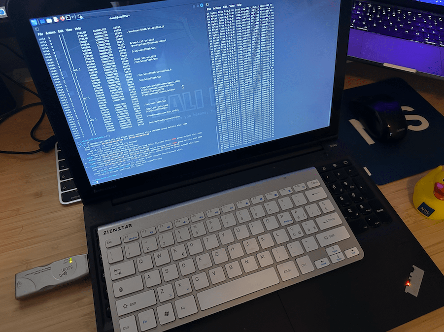 Partiamo da qualcosa semplice da replicare. Con una linux-box installata su un laptop che abbia un adattatore Wireless teoricamente siamo gia’ nelle condizioni di operare, ma ho notato che molti usano la propria linux-box (spesso una kali) tramite una guest. Per il mio lab usero’ una delle mie “macchine da battaglia”, un laptop con kali a cui aggiungo un adapter Wireless esterno, ma il principio di funzionamento e’ applicabile anche per altri contesti.