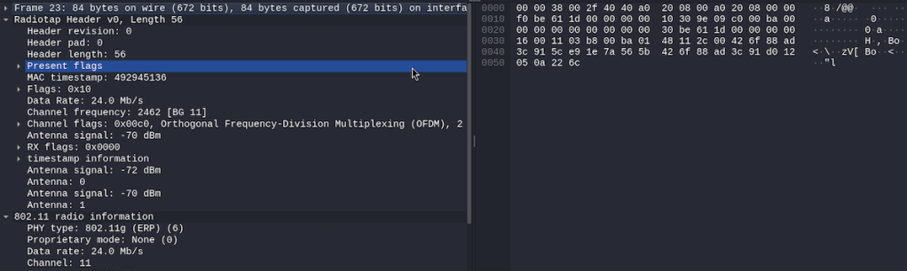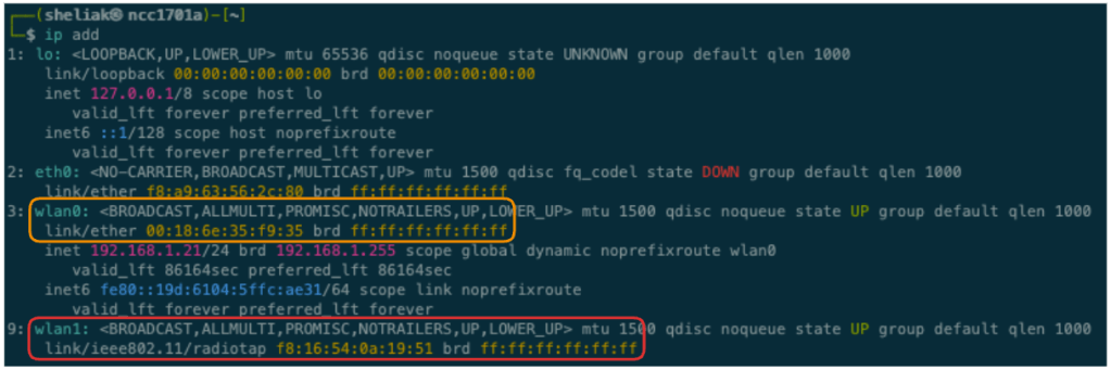 Nell’immagine ho segnato in arancione la configurazione della NIC wlan0, felicemente connessa alla rete WLAN del mio lab, e la NIC wlan1 che poco sotto riporta la specifica link/ieee802.11/radiotap che ci consente di catturare anche i RadioTap Header, una serie di informazioni aggiuntive sul sistema di radio-frequenza che stiamo osservando.