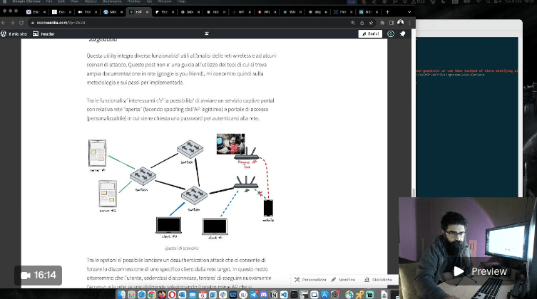 Questa utility integra diverse funzionalita’ utili all’analisi delle reti wireless e ad alcuni scenari di attacco. Questo post non e’ una guida all’utilizzo del tool di cui si trova ampia documentazione in rete (google is you friend), mi concentro quindi sulla metodologia e sui passi per implementarla.