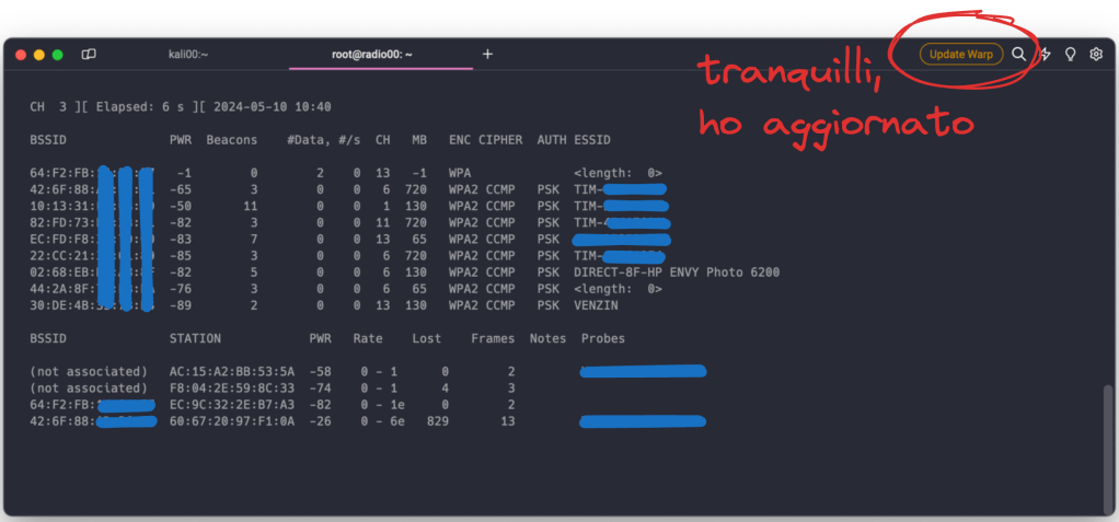 Nella prima parte del report sulla sinistra sono riportagli gli Access Point che siamo in grado di raggiungere dalla nostra posizione con indicato il nome della rete (ESSID), la potenza del segnale (PWR) ed il tipo di cifratura. Nella seconda parte troviamo l’elenco delle stazioni (i client) associati ai relativi Access Point. Abbiamo tutti i dati per farci un’idea a distanza dei dispositivi in uso dal target.