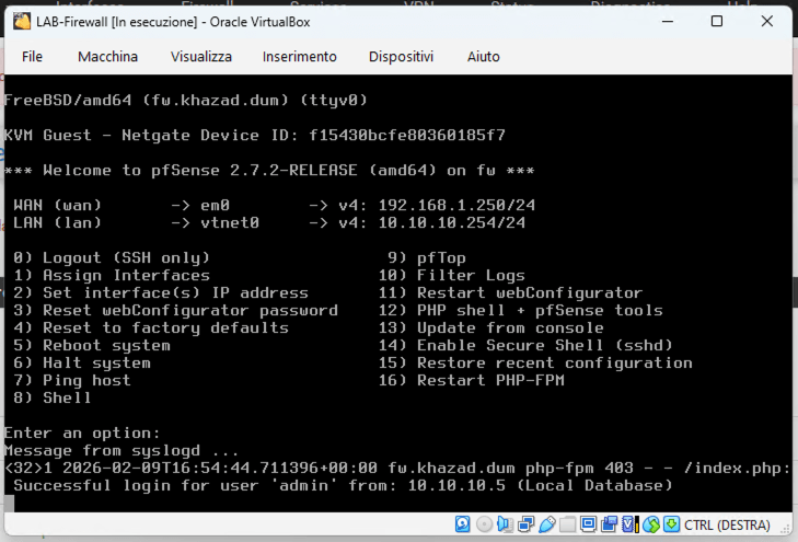 Una volta installato sarà possibile eseguire la prima configurazione a livelli rete dall’interfaccia text-based disponibile tramite la console della VM. Una volta definito l’IP lato LAN sarà possibile accedere all’interfaccia di gestione via web tramite la rete LAN.