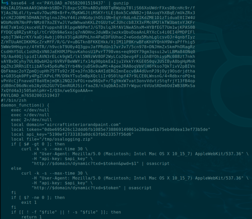 Cosa fa lo script che abbiamo trovato? Non è nulla di complesso ma la cosa mi ha interessato in quanto mi capita di rado di lavorare su client OSX. Se siete poco avvezzi allo shell scripting – male – potete chiedere un aiuto ad un LLM che per questo tipo di compiti è un buon supporto. Ovviamente se siete figure tecniche del mondo IT o SEC e avete bisogno di un LLM per leggere uno script è bene che siate consapevoli del fatto che probabilmente avete un problema di competenze. Qui analizzo le parti più interessanti del payload.