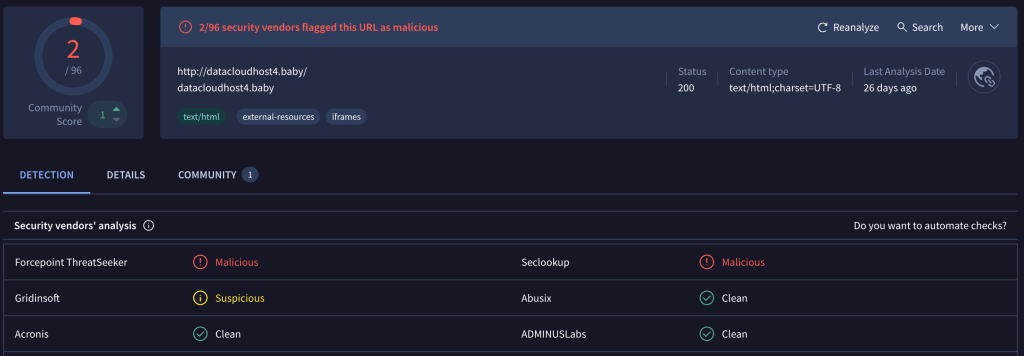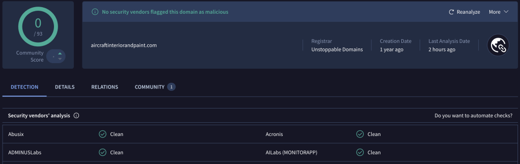 Interessante notare che il secondo dominio, quello usato per l’hosting del payload ed il C2, non risultava segnalato da nessun vendor al momento dell’analisi.