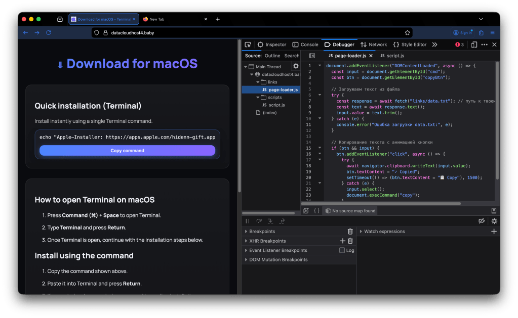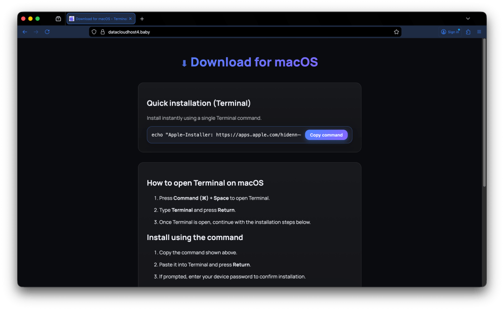 Chi è del mestiere, nel vedere un sito che ti dice di eseguire un comando sul tuo terminale, sente già puzza di bruciato. Visto che l’ambito lo studio delle tecniche di attacco fa parte dei miei interessi e del mio lavoro ho colto l’occasione per analizzare l’azione del bad-actor più in dettaglio.
