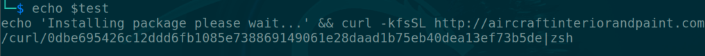 Dagli output si nota che l’intenzione del primo comando è eseguire il download di un contenuto appoggiato su un ulteriore sito web (durante l’analisi questo dominio è cambiato un paio di volte). Anche di questo contenuto si vorrebbe tentare l’esecuzione via zsh.