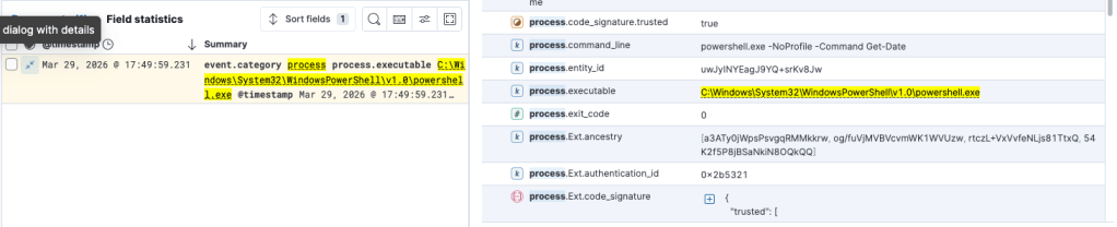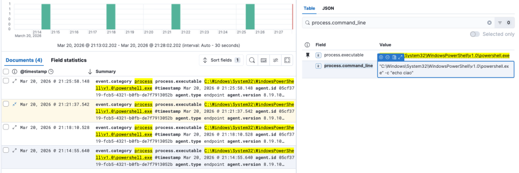 Ed ecco la magia, questa volta process.command_line riporta come argomento il comando Get-Date, ovvero quello che abbiamo utilizzato come falso comando per evitare che l’EDR veda il vero comando che abbiamo utilizzato.
