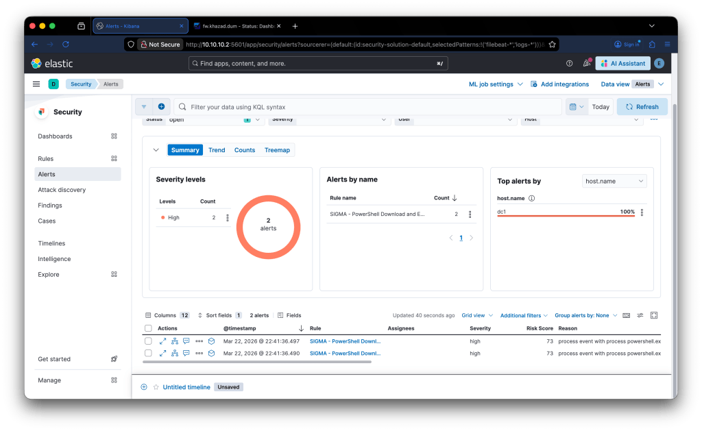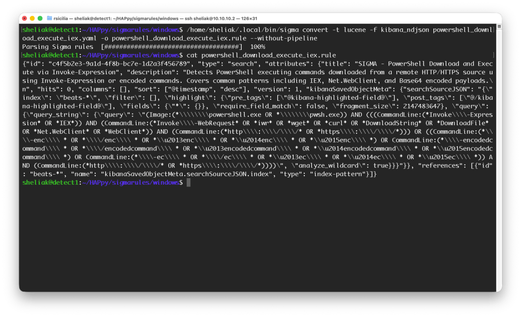 L’output della conversione della sigma rules lo possiamo usare sul nostro EDR / SIEM implementato nel lab: Elastic. Piccola nota tecnica: ho incontrato un po’ di problemi con il converter ed ho dovuto ritoccare a mano al regole in quanto gli escape generavano degli errori, la regola nella repo è quella corretta “a mano” e la trovate nella repo.