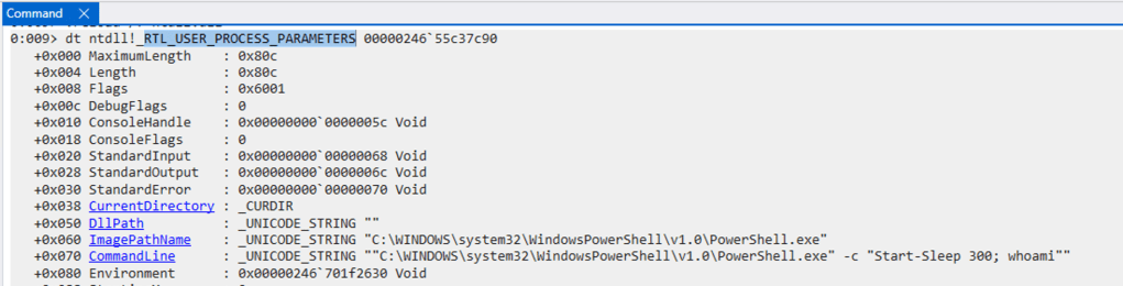Quello che accade a basso livello lo si può osservare con WinDbg analizzando le informazioni presenti in memoria quando viene creato un processo, ad esempio un comando powershell con degli argomenti: