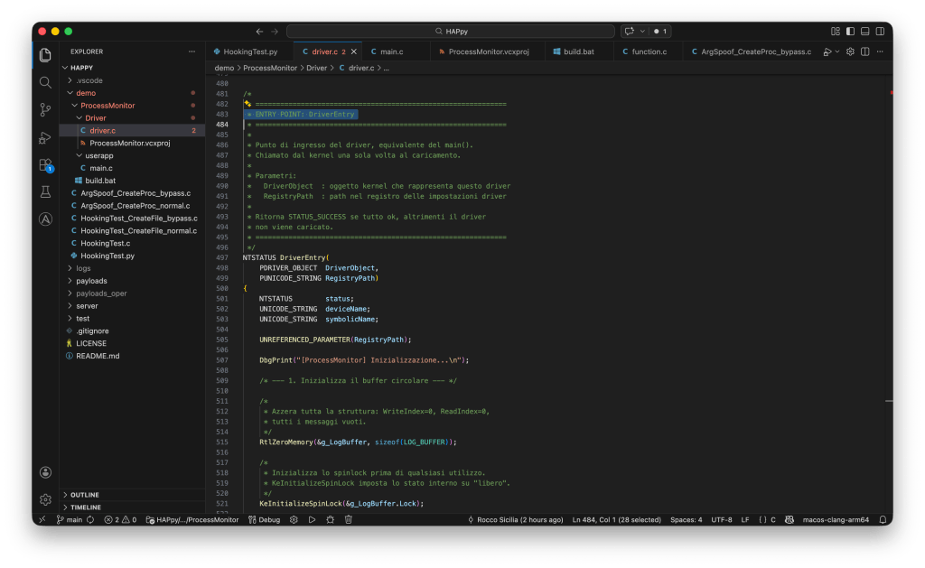 È importante sottolineare che questa registrazione avviene a livello di kernel: la callback non è un normale programma in esecuzione, ma codice che gira nello strato più privilegiato del sistema operativo, ovvero in kernel mode. Questo è il motivo per cui gli EDR utilizzano un driver e non una semplice applicazione. Ora, a mio modo di vedere per capire bene questo meccanismo bisogna metterci le mani ed impastare bene, quindi proviamo a scriverci il nostro driver per registrare la nostra callback. Come avevo detto nel precedente articolo anche in questo caso mi baso sugli esempi utilizzati anche in famigerati testi di riferimento per queste tematiche, piegandoli un po’ alle mie esigenze e semplificandoli per “abbassarli” al mio livello di conoscenza di C e della programmazione in ambiente Microsoft.
