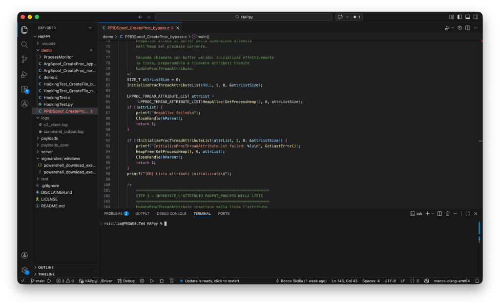 Perché dovremmo voler modificare il Process ID del processo padre rispetto al nostro processo “malevolo”? La tecnica punta a generare confusione rispetto a ciò che verrà registrato dall’EDR: gli analisi hanno interesse a capire da quale processo/applicazione è stato lanciato il processo sospetto in quanto alcune tecniche di attacco prevedono specifiche “sequenze” si azioni.