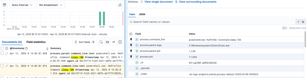 Il comando eseguito, come si diceva, è un processo powershell che esegue una sleep e come PPID usiamo quello dell’applicazione Windows Calculator che nella demo è 1728. L’evento di creazione del processo viene notificato all’agent di Elastic e possiamo andarlo a cercare.