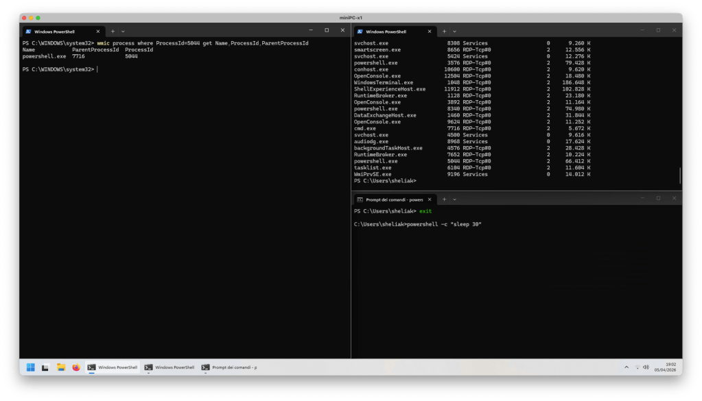 In questo modo il processo powershell partirà e resterà attivo per 60 secondi, più che sufficienti per verifica con il comando tasklist il PID del comando powershell (5044 nel mio test) e verificarne il padre: