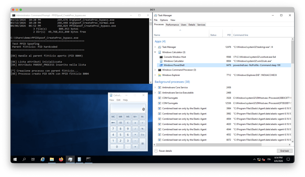 In questo semplice esempio utilizzeremo un PPID specifico di un processo già attivo sul sistema che, come si vede dall’immagine, è l’ID 8004 che corrisponde al processo Windows Calculator.